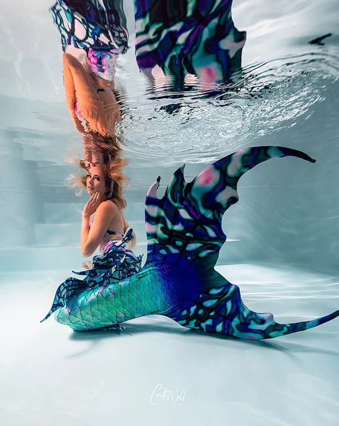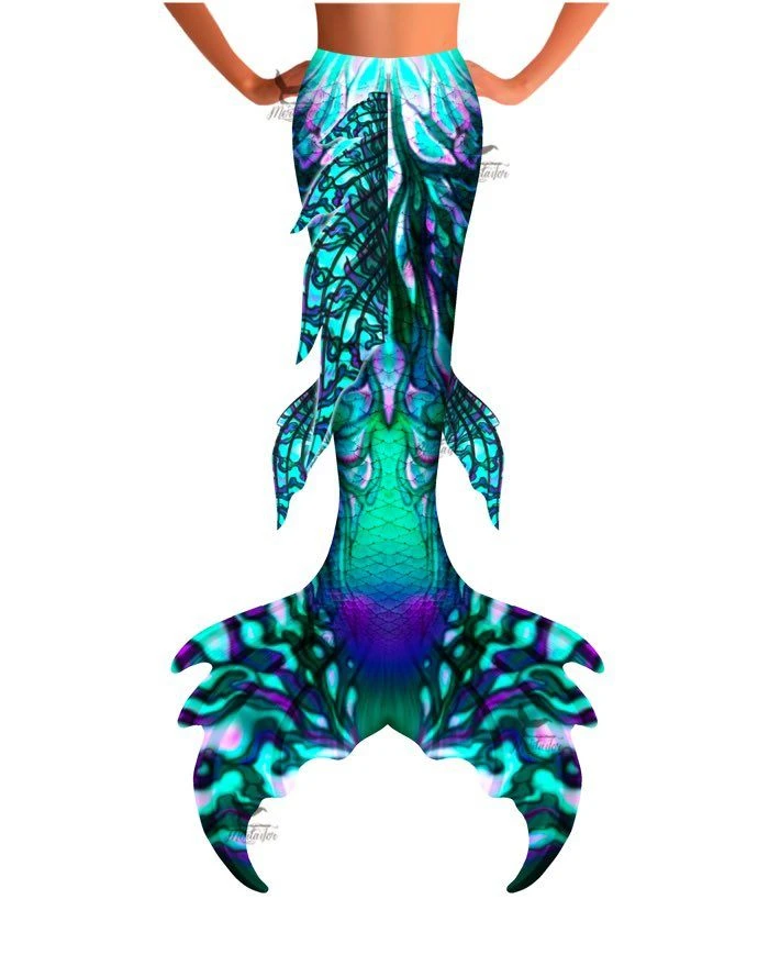 Enjoy the Crème de la Crème and revel in the comfort and beauty of our new wondrous Mertailor Whismy Fantasea Tail Skin. You will absolutely fall in love with the soft silky feel of the cushy luxurious scuba knit material and will be mesmerized by the brilliance of the colors that practically glow as you glide through the water. A breeze to slip in and out of, this tail skin has a snug 1” wide spandex waistband that will stay in place while swimming. Made from 1mm thick poly spandex nylon knit fabric with a durable water repellant coating, this is the perfect tail solution for any water or posing experience.  The dye sublimated print ensures long lasting color. Made to fit the Mertailor Fantasea fin Too, tail skin has a side zipper at the fluke to allow for ease of insertion of your Fantasea fin.  Comfort plus comfort…and beautiful to boot!  It doesn’t get much better than this!Â
