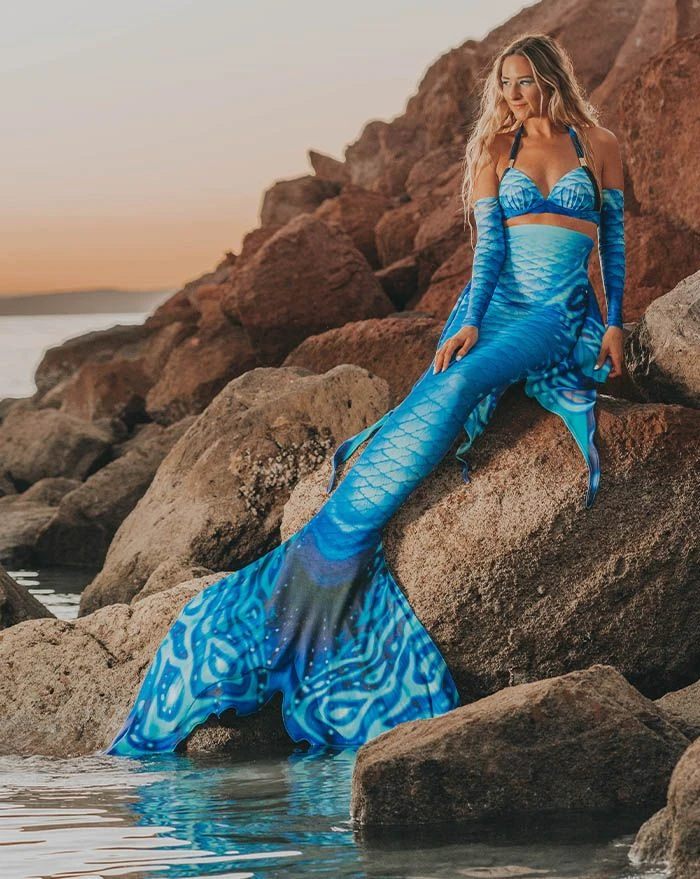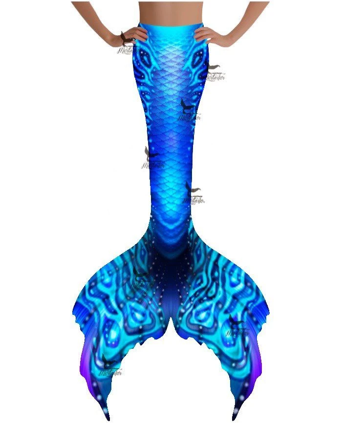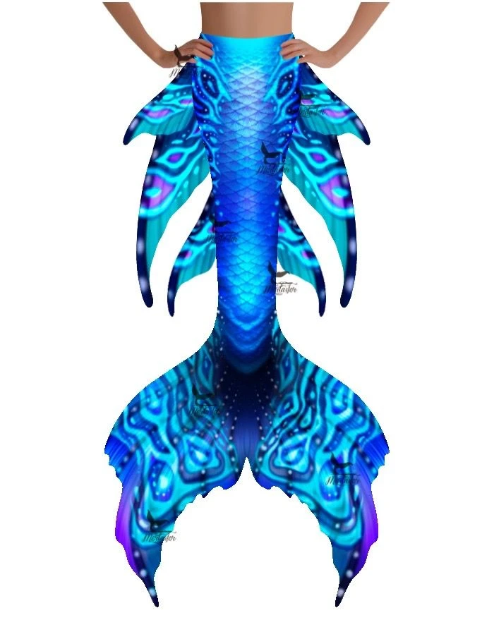 Enjoy the Crème de la Crème and revel in the comfort and beauty of our new wondrous Mertailor Whismy Fantasea Tail Skin. You will absolutely fall in love with the soft silky feel of the cushy luxurious scuba knit material and will be mesmerized by the brilliance of the colors that practically glow as you glide through the water. A breeze to slip in and out of, this tail skin has a snug 1” wide spandex waistband that will stay in place while swimming. Made from 1mm thick poly spandex nylon knit fabric with a durable water repellant coating, this is the perfect tail solution for any water or posing experience.  The dye sublimated print ensures long lasting color. Made to fit the Mertailor Fantasea fin Three, tail skin has a side zipper at the fluke to allow for ease of insertion of your Fantasea fin.  Comfort plus comfort…and beautiful to boot!  It doesn’t get much better than this!Â
